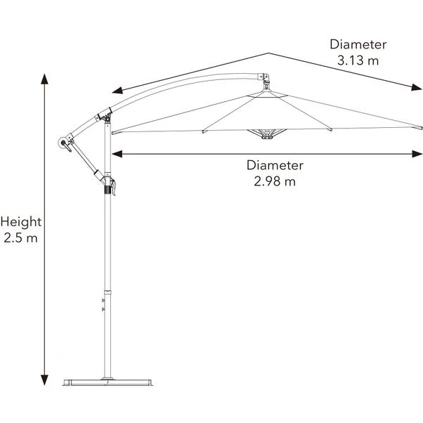 Keep yourself shaded from the sun with this Cantilever Grey 3m Parasol. This parasol can be used as a free-standing parasol using a weighted base to keep the parasol in place. This product features an easy to operate crank which will help you to adjust the canopy position when required. It is recommended that the parasol remains closed when not in use and is always kept closed in extremely windy conditions. This grey parasol adds the perfect splash of colour to any outdoor space.