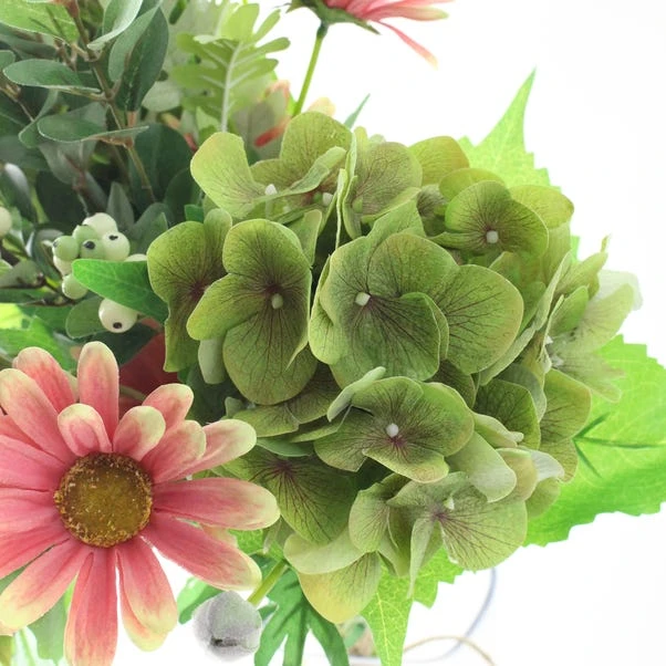 Our elegant realistic bouqets consit of Ball Hydrangeas, Daisies, Dusty Miller and Snowberry Spray flowers. These would be perfect to display in your home or as a gift.