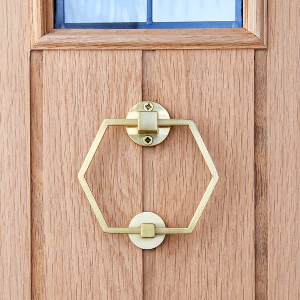 Designed with a classic brushed gold finish, this door knocker has a contemporary hexagon design which will be a great finishing touch for your door. The zinc alloy die casting is easy to fit onto your door and wipe clean. Please not that fittings are not included with this door knocker.