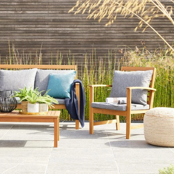 This contemporary and stylish outdoor coffee set is sure to add some flare to your garden or patio and is made up of two chairs, a bench, and a low rectangular table. Made from responsibly sourced, FSC-certified acacia. By choosing this product, you are supporting responsible management of the world’s forests.