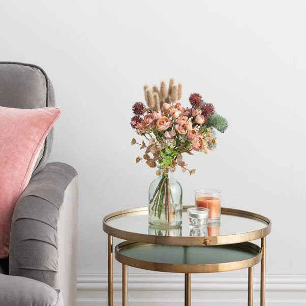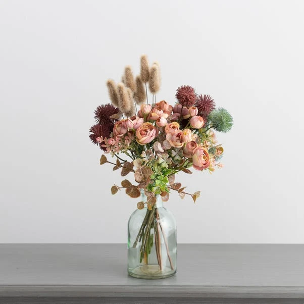 Stunning in every way, this bouquet features an array of lagarus, chestnut and ranunculus stems in a beautiful pink and green colourway. The bouquet is made from individual stems that can be arranged to preference, either by cutting it down to suit smaller vases, adding in real flowers or splitting across multiple vessels. The faux flowers are longer lasting than real flowers with no maintenance required. Conveniently packaged in a box specifically designed to fit through a letterbox, our letter box bouquet makes the perfect gift. Just confirm the delivery address has a standard sized letter box with 1m of space behind it to ensure a successful delivery.