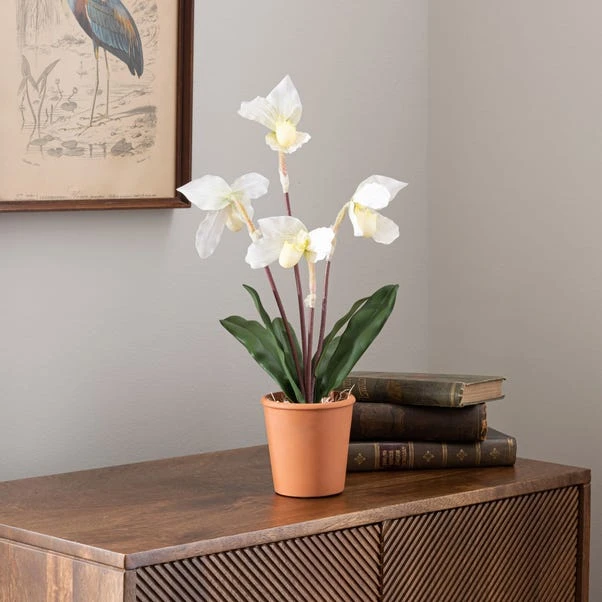 This beautiful Real Touch Slipper Orchid has a classic cream design and colourway that will complement an array of home decors beautifully. The realistic design made with high-quality, real-touch material comes complete with a terracotta pot, it is ideal for display, either alone or as part of an arrangement.