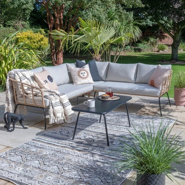 Create an outdoor oasis in your backyard with this luxurious 5-seater corner set. Made from natural rattan and metal, it’s weather-resistant steel table and powder-coated steel frame will stand the test of time and provide years of lasting beauty. With seat pads included for extra comfort, you’ll be able to entertain family and friends all summer long!