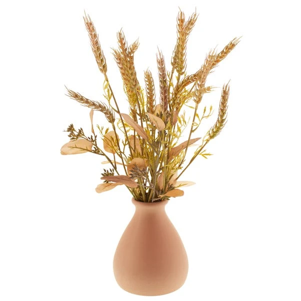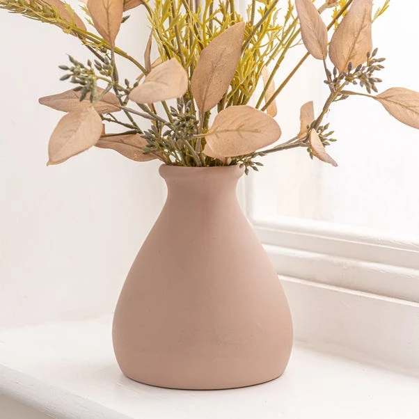 Set in a matte dusky pink vase, this modern wheat and seeding eucalyptus has a natural design and realistic finish, ideal for displays in any room of the house on shelves, sideboards and tables.