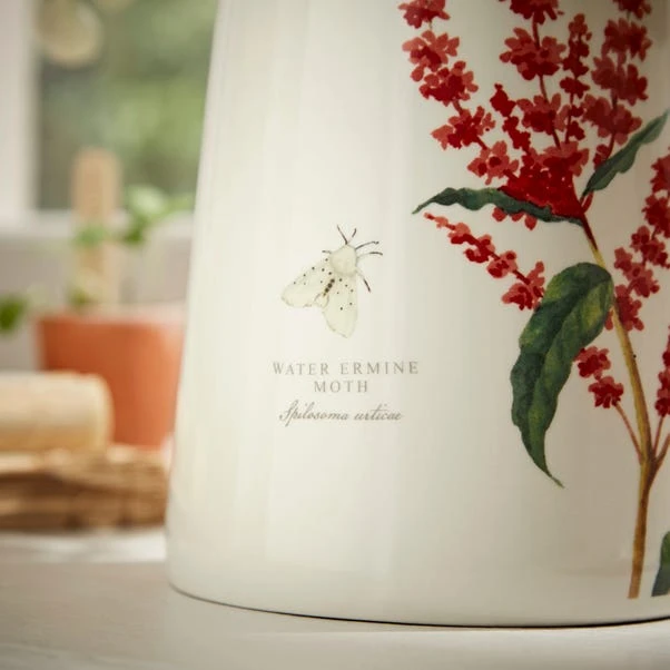 This Marsh Botanical collection across Home Decor depicts flora and fauna that rely on one another for survival. Water dock is a tall plant with slender leaves and spikes of tiny pink flowers that can be found at the edge of canals, rivers and ponds. The larvae of the Water Ermine moth, a scarce moth species confined to coastal areas in the south-east of England, feed upon marshland plants such as Water dock.